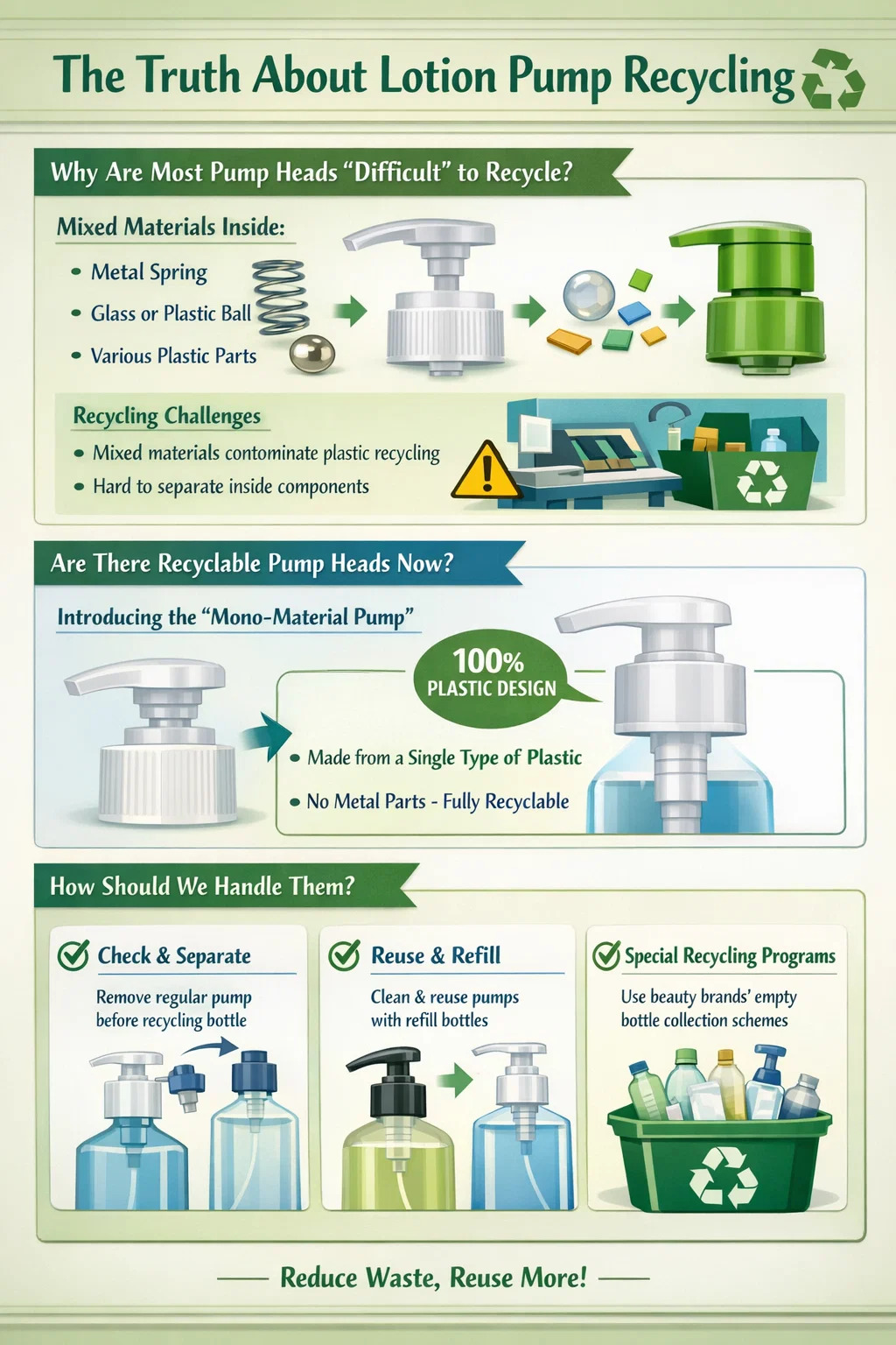 در حالی که بیشتر بطری های پلاستیکی که ما روزانه استفاده می کنیم قابل بازیافت هستند، وضعیت سر پمپ پیچیده تر است.
