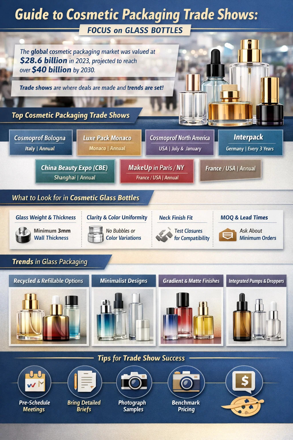 اگر بسته بندی محصولات آرایشی و بهداشتی را تامین می کنید - به ویژه مواد درجه یک مانند بطری های شیشه ای لوازم آرایشی و بهداشتی - شرکت در نمایشگاه های تجاری مناسب یکی از کارآمدترین تصمیماتی است که می توانید بگیرید. در یک مکان واحد، میتوانید صدها تامینکننده را مقایسه کنید، نمونههای فیزیکی را مدیریت کنید، مستقیماً در مورد قیمتگذاری مذاکره کنید، و روابطی ایجاد کنید که تکرار آن ماهها طول میکشد. بازار جهانی بسته بندی لوازم آرایشی تقریباً ارزش گذاری شد 28.6 میلیارد دلار در سال 2023 بر اساس تحقیقات گراند ویو، پیش بینی می شود تا سال 2030 به بیش از 40 میلیارد دلار برسد. نمایشگاه های تجاری جایی است که بخش قابل توجهی از این بازار شکل می گیرد - معاملات انجام می شود، روندها تنظیم می شوند و شبکه های تامین کننده ساخته می شوند.