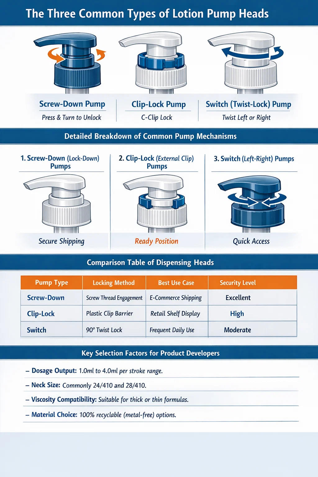 پیچ به پایین سر پمپ لوسیون استاندارد صنعت برای امنیت حمل و نقل است. برای فعال کردن آن، کاربر باید سر را به سمت پایین فشار داده و آن را در جهت عقربههای ساعت یا خلاف جهت عقربههای ساعت بچرخاند تا بالا بیاید. این طراحی بسیار موثر است از بین بردن ترشحات تصادفی در هنگام لرزش شدید در کانتینرهای حمل و نقل.