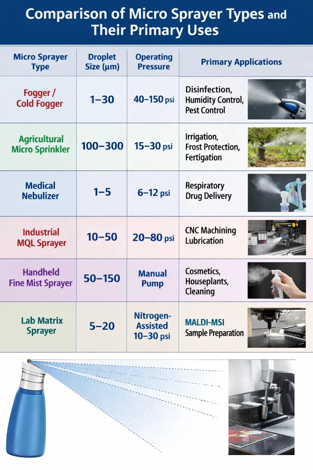 پیکربندی های مختلف میکرو سمپاش برای کاربردهای خاص بهینه شده است. انتخاب نوع اشتباه منجر به پوشش ضعیف، هدر رفتن مواد یا آسیب تجهیزات می شود. جدول زیر متداول ترین انواع سمپاش های میکرو، اندازه قطرات معمولی، فشار عملیاتی و بهترین موارد استفاده را خلاصه می کند.