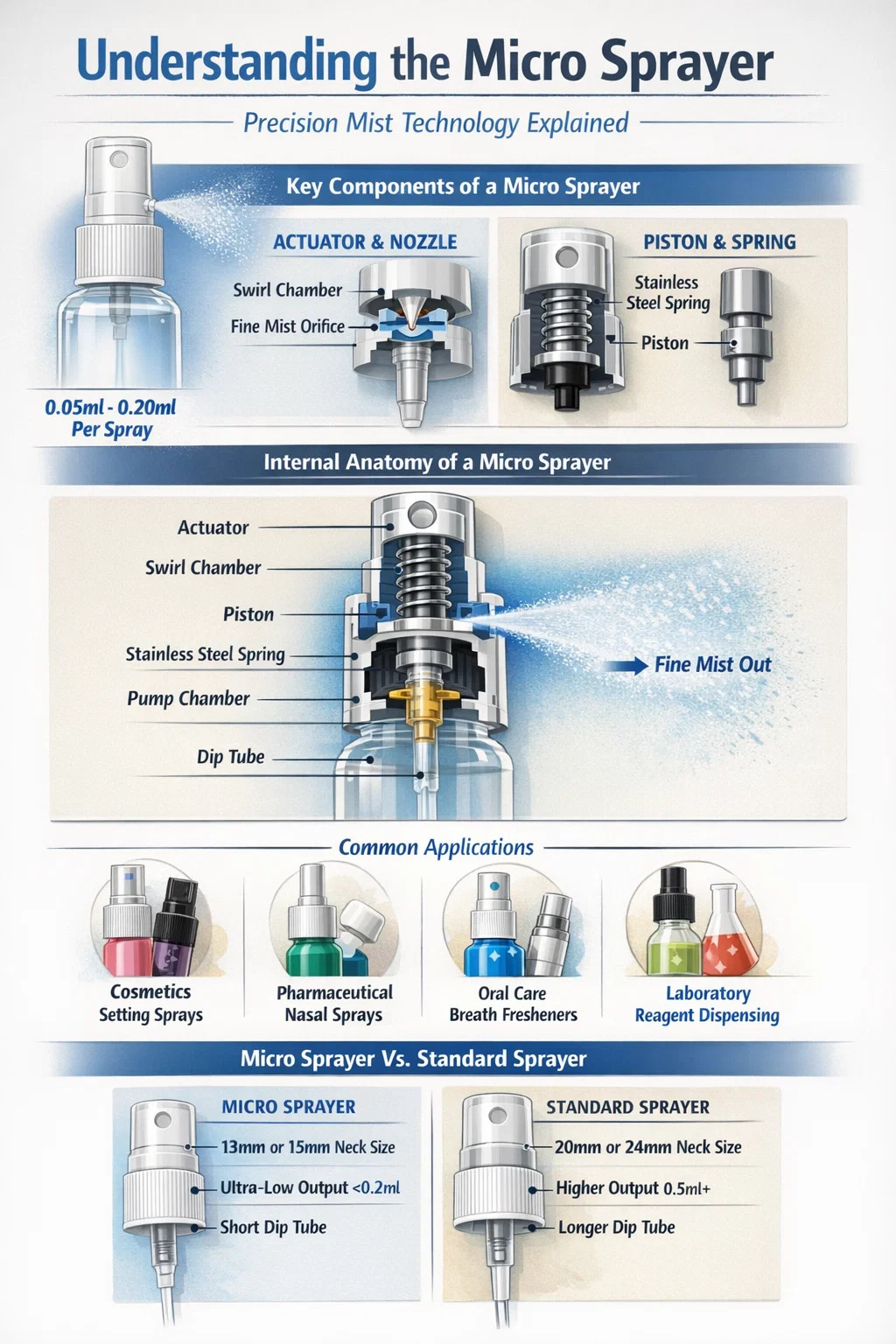 برای پاسخ به سوال "میکرو سمپاش چیست؟" این یک دستگاه توزیع با مهندسی دقیق است که برای تبدیل مایع به یک غبار بسیار ریز و سازگار با حجم خروجی بسیار کم در هر ضربه طراحی شده است. بر خلاف سمپاش های ماشه ای استاندارد که برای نظافت خانگی استفاده می شود، الف میکرو سمپاش به طور معمول بین 0.05 میلی لیتر و 0.20 میلی لیتر محصول در یک زمان، آن را به انتخاب ایده آل برای مایعات با ارزش بالا تبدیل می کند که در آن کنترل دوز و کاربرد ظریف اهمیت بالایی دارد.