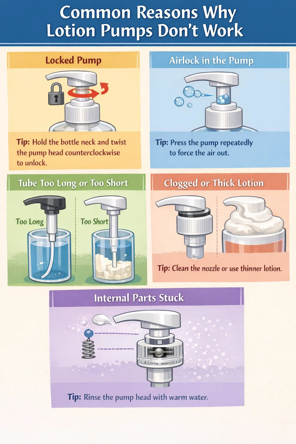 زمانی که با محصول مراقبت از پوست مورد علاقه خود مواجه می شوید، اما پمپ لوسیون از کار کردن خودداری می کند، بسیار خسته کننده است. دلیل خرابی پمپ معمولاً در چند جزئیات نامحسوس پنهان است.